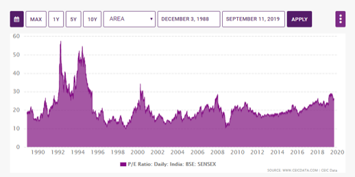 Price/Earning (P/E) ratios: Fundamentally, PE ratio is one of the best guides for selecting any stock. As the markets generally discount future cash flows, hence, share prices reflect the future earning potential of the corporate. If share prices/index rise significantly above historical averages without any rise in future earning potential/growth prospects, it may be termed as an overvalued stock/index which is due for correction at some point in the near future. Presently, as on September 2019 the Sensex is recording a daily PE ratio of 26.20. The ratio reached an all time high of 57.42 in April 1992 and a record low of 9.83 in November 1998. The PE chart shown below signals a downward movement from the present 26.20 levels towards the long term average of say 20 odd levels.